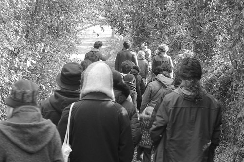 2. La restitution publique se présente comme une errance guidée par l'arpenteur le long de la ligne de faille, un récit en marche ponctuée d'impasses, d'apparitions, de retours sur soi, une visite de l'invisible d'un lieu ou d'un paysage. Conçue comme un tour d’horizon pour en avoir le cœur net, la traversée du CHA Ô nous emmène dans une fiction en marche dont les fils s’entremêlent avec le réel jusqu’à se confondre.