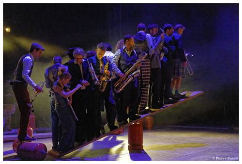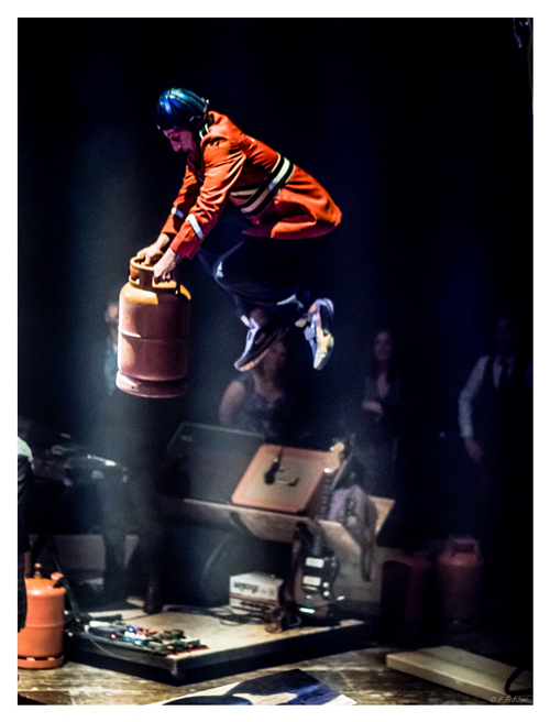 Fusion cirque et musique pour 18 musiciens live, 1 funambule des hauteurs et 2 acrobates sur planches et bouteilles de gaz