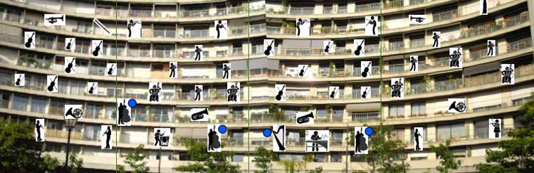 Voici que s’ajoutent à la musique, le rire d’un enfant, le ronronnement d’une télévision, une porte qui claque... Et c’est la vie de l’immeuble qui prend forme et devient partition. Un puzzle sonore magistralement orchestré pour un concert hors norme, offert à tous les vents, à tous les curieux.