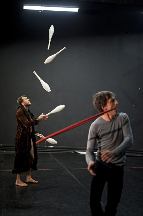 Deux jongleurs, deux hommes qui cherchent à se surpasser dans leur rapport à l’objet - des massues et des cerceaux - et qui s’épuisent dans leur quête absolue et magnifiquement vaine.