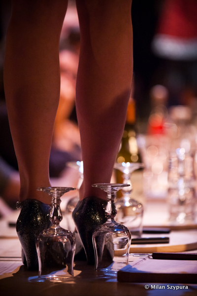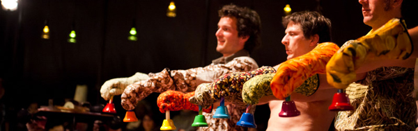 Vos neuf hôtes-circassiens surveillent les cuissons du haut de leurs cordes lisses, jonglent avec les louches, servent le vin sur une roue allemande et s’assurent que vous ne manquez de rien tout en se balançant au-dessus de vos têtes. En musique, ils transforment le quotidien en extraordinaire, ils redonnent au repas sa vocation première : le bonheur simple des rencontres et des saveurs.