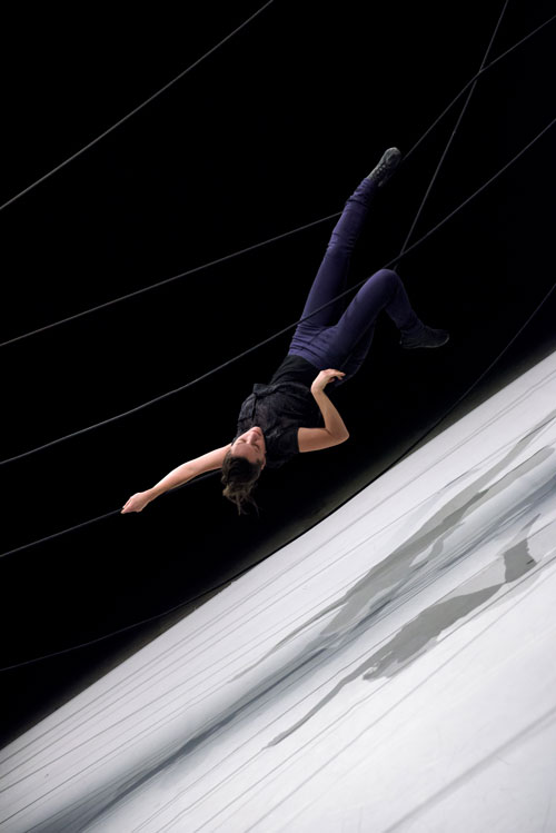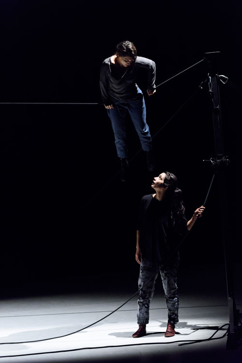 Deux femmes en quête d' équilibre, sur une corde qui change de caractère : elle se tend, se détend, se courbe, et dessine ainsi des espaces différents. Des espaces toujours infimes et mobiles, mais qui peuvent, éventuellement, constituer des lieux, des formes habitables.