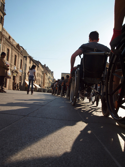 Une expérience d’urbanisme, une performance faisant appel à la participation du public qui, installé sur des fauteuils roulants, se transforme en une sorte de peloton d’exécution, en une joyeuse machine de guerre.