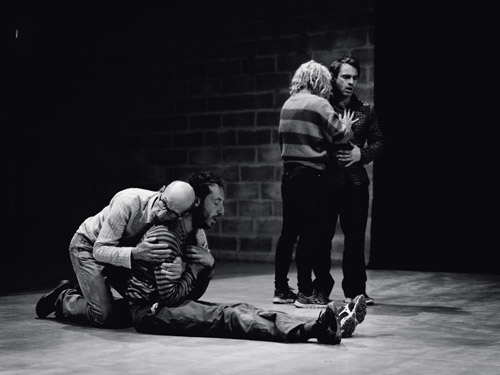« L’humain » : Proposer du jeu et des structures de jeu qui se déroulent dans une certaine fragilité, qui tiennent à peu de chose. Travailler le non-vouloir, des situations où l’idiotie, les fantasmes et les projets impossibles de chacun se révèlent avec une certaine légèreté. Laisser une porosité entre les performeurs et les personnages.
